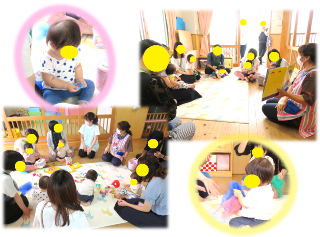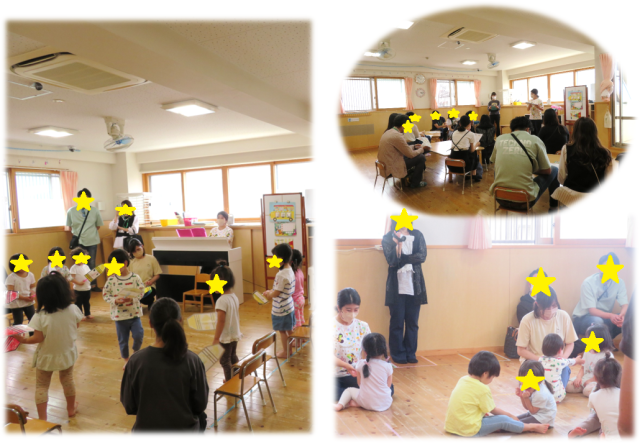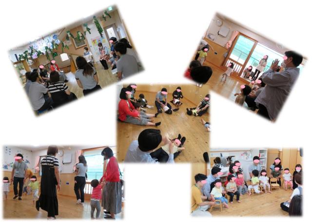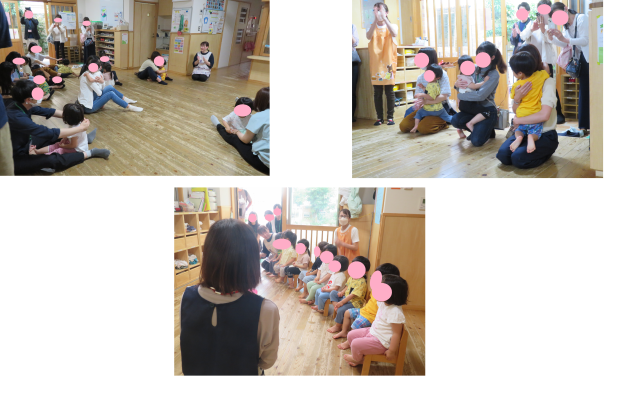 懇談会の後に、お父さん、お母さんが部屋に来てくれて皆で、体操をしたり、絵本を見たりしました。手遊びやふれあい遊びをしている時の笑顔は、園では見ないような、本当に楽しそうな笑顔を子どもたちが見せてくれました。