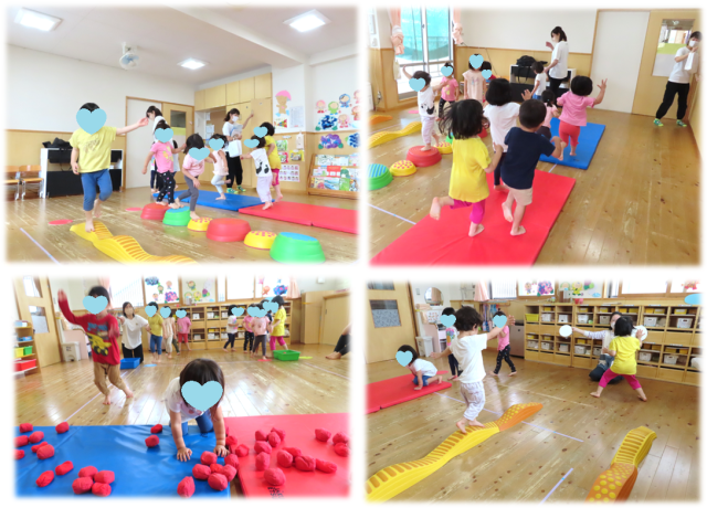 マット、デコボコ道、跳び石を使い、くまさんハイハイ(高這い)や
