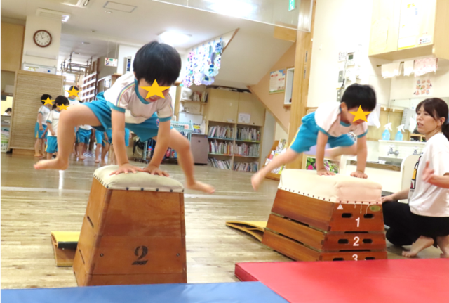 飛び越せそうだけど最後のお尻が当たってしまったり、跳び箱の前で足が開かなかったりとまだまだ練習は続きますが、最後は「まだしたーい!」の声が多く、これからが楽しみです!