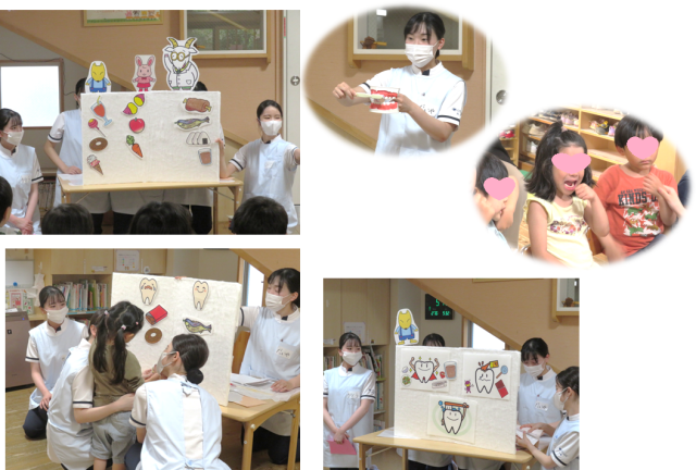 今日は、大手前短期大学の学生さんが歯科指導にきてくれました。子ども達に分かりやすく、パネルシアターで「虫歯になりやすい食べ物」「虫歯になりにくい食べ物」をクイズ形式で教えてくれました。