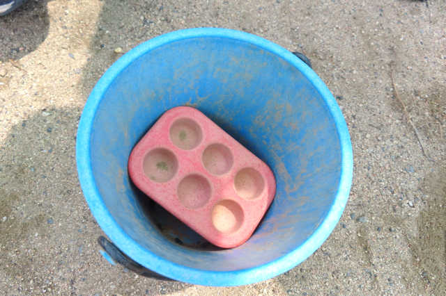 砂場に座っても泣くことなく、指でつまんだり手の平で触ってみて感触を楽しんでいました。