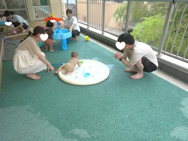 0歳児さんと一緒に水遊びを楽しみましたよ。