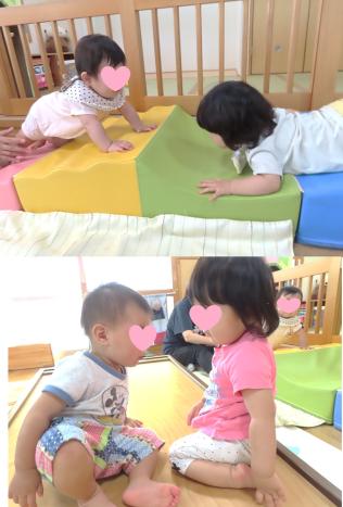 1歳児いちご組さんが、面白い事して遊んでいましたよ!