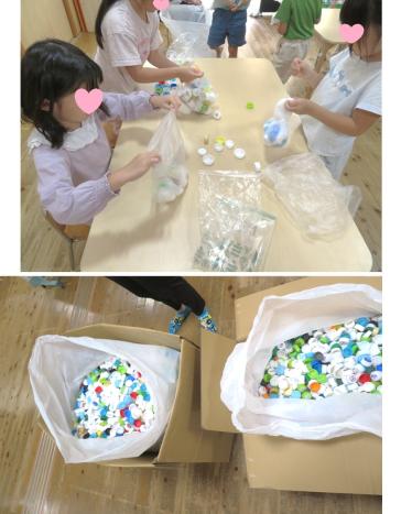 5歳児、すいか組がペットボトルキャップを集める活動をしています。