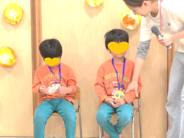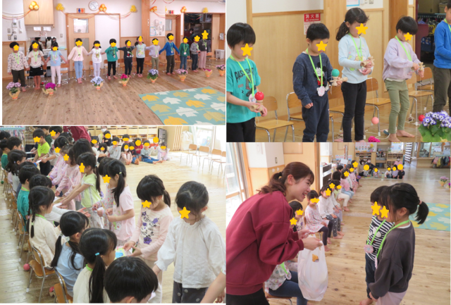 今日はすいか組さんとお引っ越しするお友だちのお別れ会をしました。すいか組さんには、自分の行く小学校や頑張りたいことを発表してもらい、今まで頑張ってきたけん玉やコマを披露してもらい、みんなの成長にたくさんの拍手が起こりました。みかん組さんからはしおりと歌のプレゼントがあり、最後には、すいか組さんから、在園児みんなへと私たちに手作りのプレゼントがあり、胸にこみ上げるものがありました。すいか組のこれからと、お引っ越しするお友だちのこれからを私たちは応援しています!