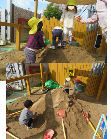 お山を見つけた子ども達は、早速駆け寄り、登って「やっほー!」と大きな声で言ったり、穴を掘って楽しんでいましたよ(^^♪