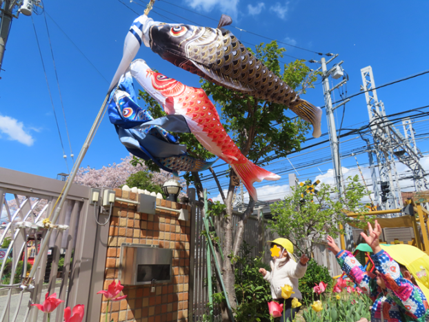 こいのぼりを園庭に出すと、風が大きく吹いてこいのぼりを泳がせ、それを見た子どもたちがとても喜んでくれていました!青空にこいのぼりに桜にチューリップと気持ちがいいですね!!