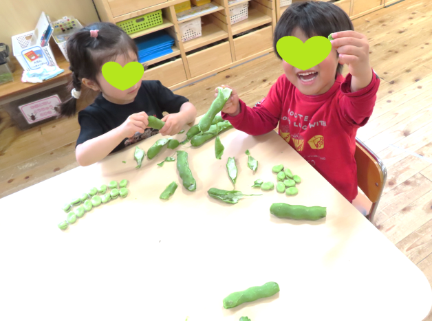 4歳児みかん組がそら豆むきのお手伝いをしました。