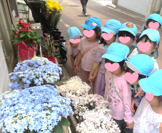 5歳児すいか組が、あじさいのお花を買いに商店街までいきました。