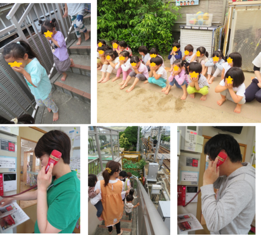 給食室からの火災を想定しての避難訓練をしました。先月行った火災訓練で覚えた「口をおさえて、姿勢をひくく」をしっかりと実践できている子どもたちでした。職員は実際に消防署への通報訓練を行い、もしもの際にしっかり対応できるように備えたいと思います。