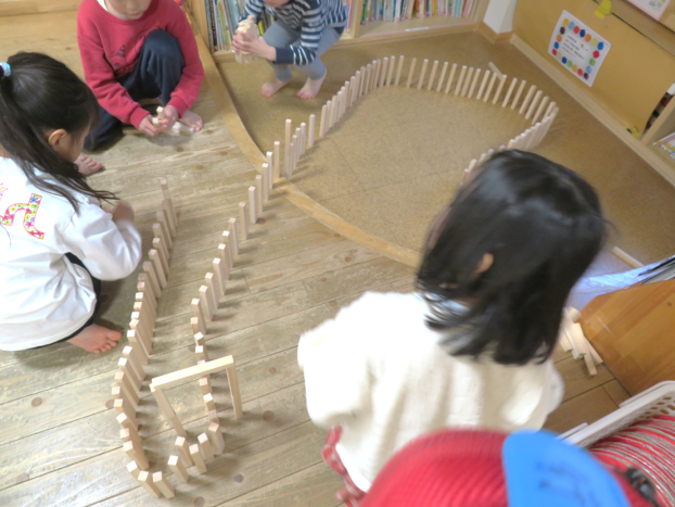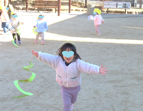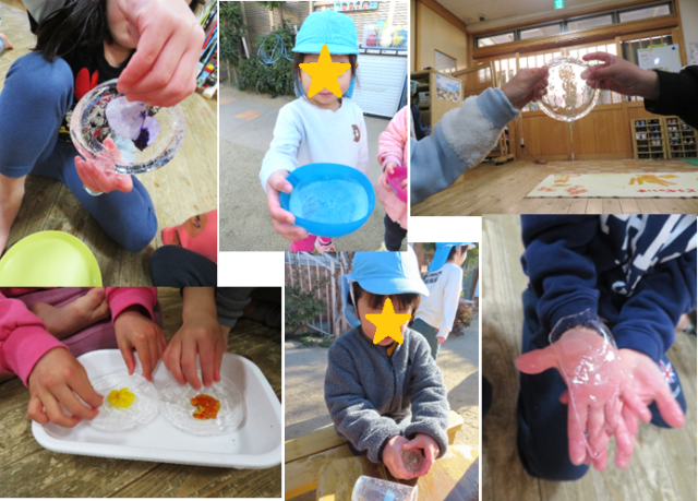この連日の寒さで氷ができるのか、子どもたちは前日から色んな容器に水を入れ、色んな場所に準備していました。今朝はしっかり氷ができていて「つめたーい!」「きれいー!」と大喜びでした。この寒さも楽しみにしてしまうみんなは楽しむ天才です!