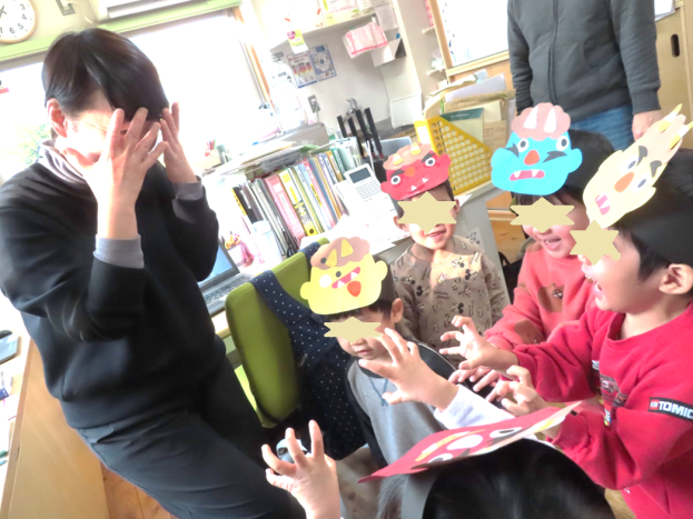 今日はみんなで節分の集まりをしました。節分のおはなしを聞きながら子どもたちからは「きのうまめまきしたよー!」「まきずしたべたよー!」の声が聞こえました。「オニのパンツ」のパネルシアターを見たり「まめまき」のうたを歌ったりして、そのあとはぽっぽ保育園のみんなでオニが入ってこないように、玄関にむかって元気に「おにはそとー!ふくはうちー!」と豆まきをしました。みんなが笑顔で幸せに過ごせますように!