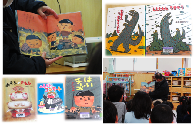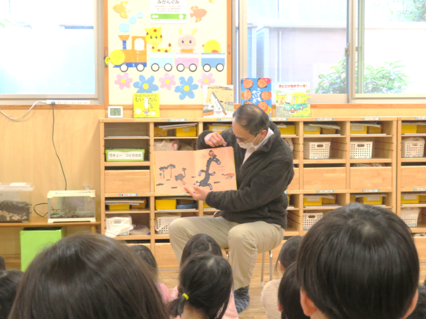 今日は2月の絵本読み聞かせの日でした。今日も5冊の絵本を子どもたちに読んでくださいました。その中の宮西達也さんの「おまえうまそうだな」「ヒヒヒヒヒうまそう」のシリーズは子どもたちにも人気で保育園にも絵本が置いてあります。中井先生、今月もたくさんのお話しありがとうございました。