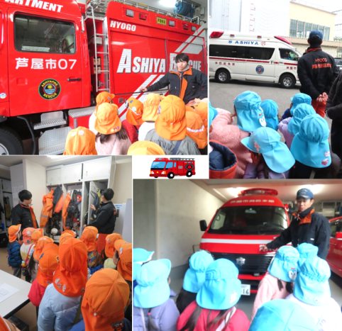 今日はみかん組とすいか組で芦屋市消防署に見学に行ってきました!消防署の中も見学させてもらい、消防士さんたちがどんな風にお仕事をしているのかも教えていただきました。見学中に救急車の出動があり、素早く準備をする様子を間近で見ることができ、その速さにびっくりしました!最後には抱っこしてもらったり、写真を撮ってもらったりして楽しい時間を過ごすことができました。芦屋市消防署のみなさんありがとうございました!