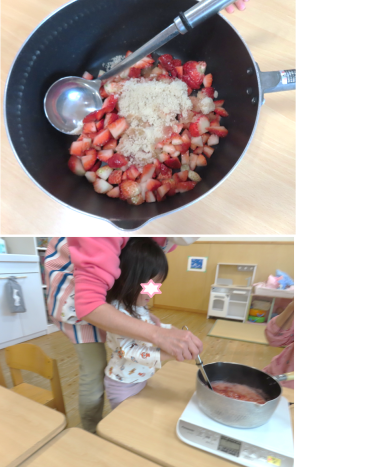1歳児いちご組がいちごジャム作りクッキングをしました。