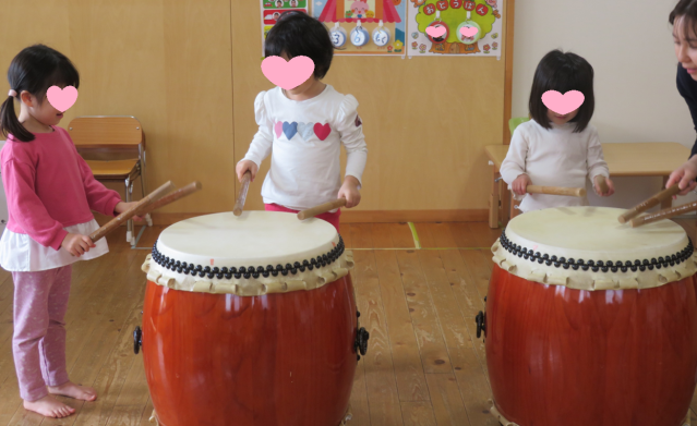 子ども達に太鼓あそびの感想をきくと、「大きな音が出る所が良かった!」「大きくも、小さくも叩けるところが良かった」「ふちも叩けて楽しかった」など感想を話してくれましたよ。