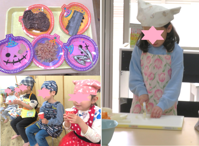 5歳児すいか組が、お出汁の飲み比べと、お味噌汁つくりをしました。