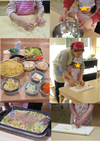 今日は、2歳~5歳クラスでクッキングをしました!作るものは「焼きそば」と「たまごスープ」で、たくさんの食材を手分けして、それぞれクラスごとに準備をしました。2歳クラスは食材を手でちぎったり、わけたり、3歳クラスはキッチンバサミを使い、4歳5歳は包丁を使いましたが、4歳は先生と一緒に、5歳は自分で!と、成長とともにやれることが増えていき、たのもしい子どもたちでした!そして、元気な子どもたちの「いただきます!」で食べた、焼きそばとたまごスープは最高でした!
