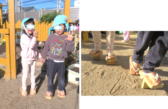 今日の朝は、下駄あそびをしていましたよ。寒いけどへっちゃらです!