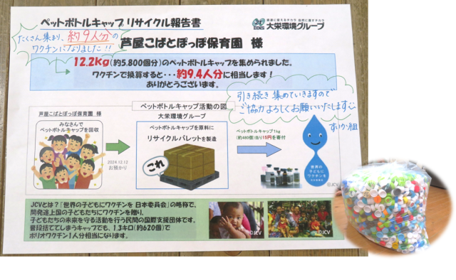 ペットボトルキャップが5800個・12.2キロ集まりました。9.4人分のワクチンになります。
