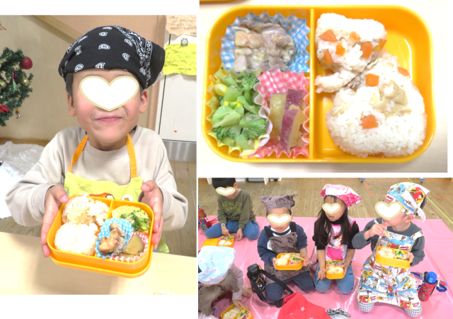 熱々炊き込みご飯を自分でおにぎりにして、おかずも自分たちで詰めていきます。
