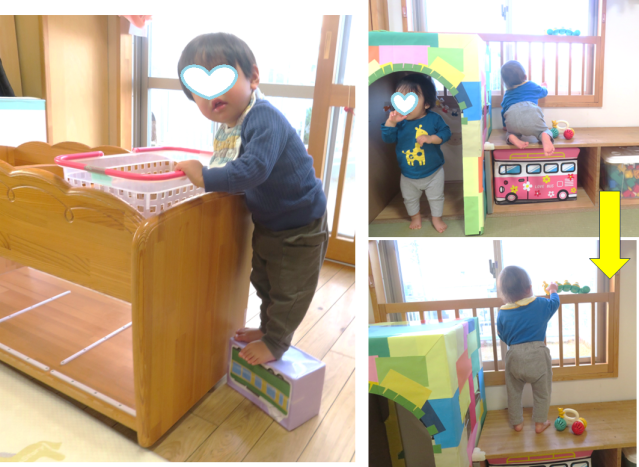 さくらんぼ組のお部屋は、登るところがたくさんあります。窓際に置いた高い棚にあっという間によじ登り、一人で上手に降りてきます。
