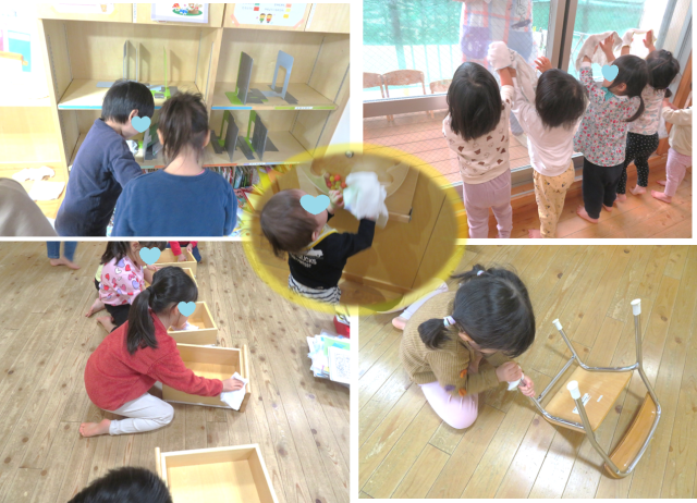 お部屋の窓、ロッカー、椅子など自分たちの使ったものをきれいにお掃除しました。