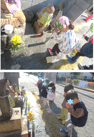 2歳児もも組に、園の前にあるお地蔵様にお花をいけてもらいました。
