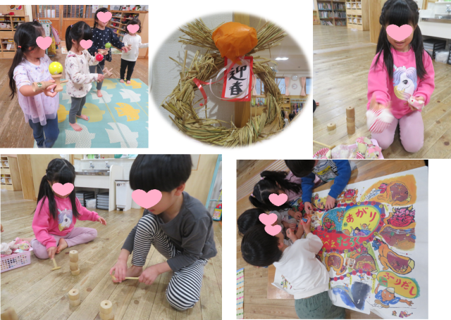 早速幼児さんは、お正月遊びに夢中でしたよ。すごろく、かるた、だるま落とし。お手玉など・・・とても楽しそうでしたよ(*^^*)