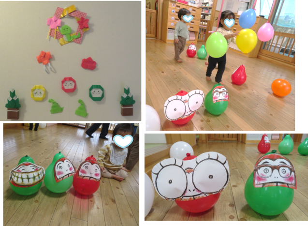 0歳児の保育室では大好きなだるまさんがたくさんいましたよ。