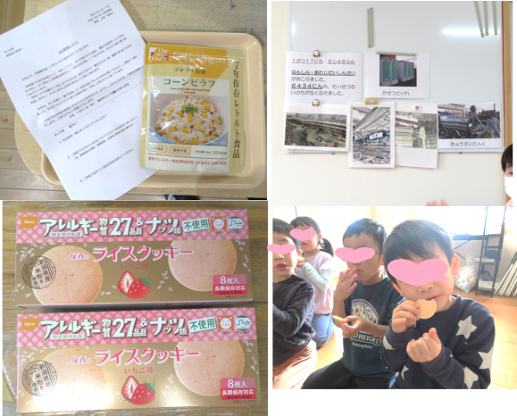 防災食のいちごクッキーはおやつで、コーンピラフはお家で味わってもらいます。