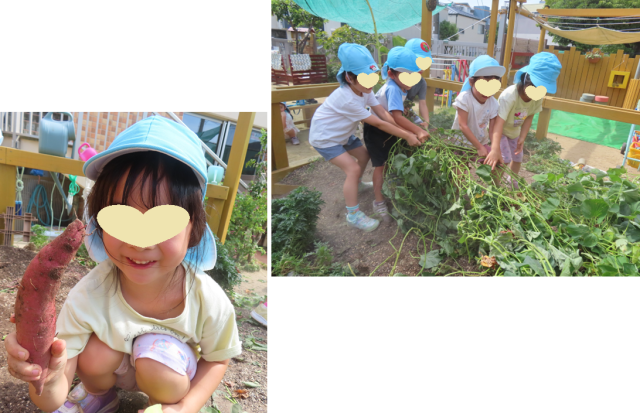 土のう袋には、一つもお芋はなく、元気に園庭まで伸びたお芋のツルの下から大きなお芋が掘れました!固い園庭の土の下で育った「ド根性さつまいも」です!