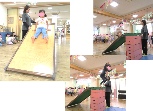 5段をよじ登り滑り台をすべったり、戸板を駆け上がりジャンプしたり、とっても楽しそうでしたよ!みんな忍者みたいに機敏な動きでした(^^♪