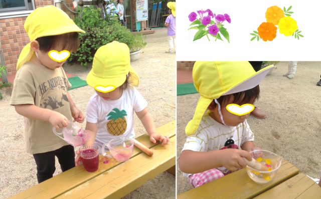 園庭にマリーゴールドとオシロイバナが咲いています。それを摘んで色水遊びをしました。