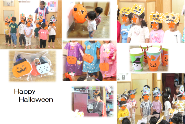 今日の異年齢交流はさくらんぼ組からすいか組までみんなホールに集まって、ハロウィンパーティーをしました。各クラスで作ったお面や衣装を身につけ、魔女の先生がピアノを弾いたり、みんなでダンスを踊ったり、最後にはかぼちゃの折り紙のプレゼントをもらって、楽しい時間になりました!!
