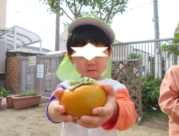 園庭の柿がたくさん実を付けています。各クラス順番に収穫を楽しんでいます。