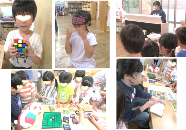今日は、すいか組を対象に、福祉学習会がありました。視覚障がい者の富岡さんをお招きして、点字を打つ所を見せていただいたり、点字付きの絵本、図鑑、国旗、ルービックキューブを実際に触らしていただきました。