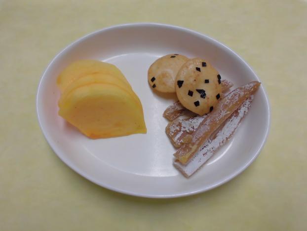 今日のおやつは、お菓子と柿でした。