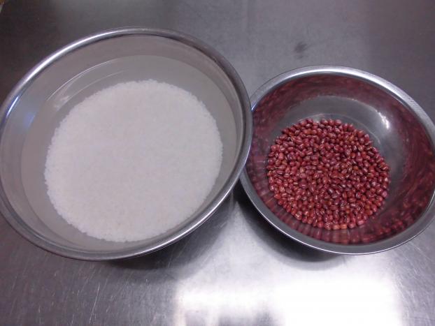 もち米は前日から洗って水につけてもどし、明日すぐに使えるよう準備しています。