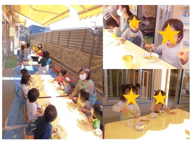 昨日はお別れ会があり、くま・うさぎ組さんは園庭で給食を食べました!