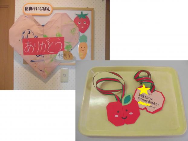 先日のお別れ会で、給食室から卒園児のみんなに、「給食をたくさん食べてくれてありがとう!」の気持ちをこめて、りんごのメダルをプレゼントしました。