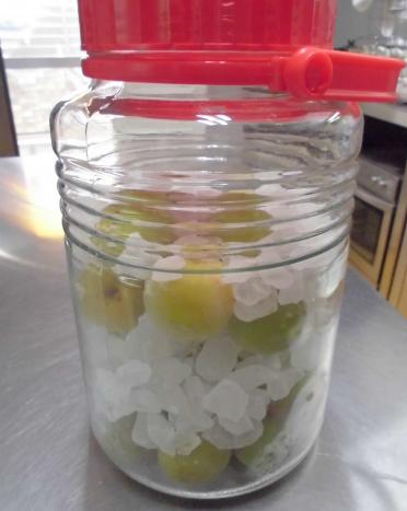 各クラスで凍った梅と氷砂糖を瓶に入れるところを見てもらいました。