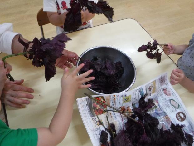 みんな上手に茎から葉っぱをちぎることができました。大胆にちぎる子や、小さな葉っぱも残さずきれいにちぎる子、それぞれのちぎり方でたくさん用意していた赤しそも、あっという間にお手伝いが終わりました!