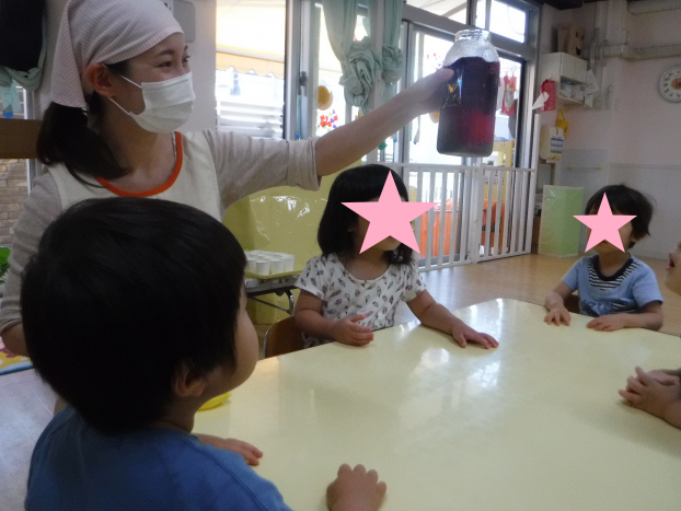 今日はくま組のみんなに、“しそジュース”作りのお手伝いをおねがいしました。