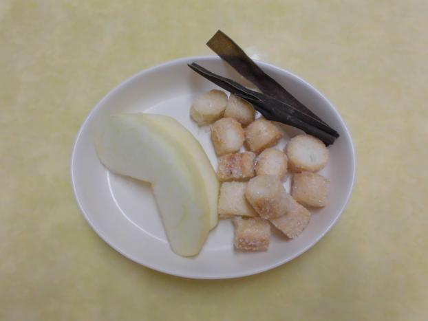今日のおやつは「抹茶ケーキ」と「りんご」でした。