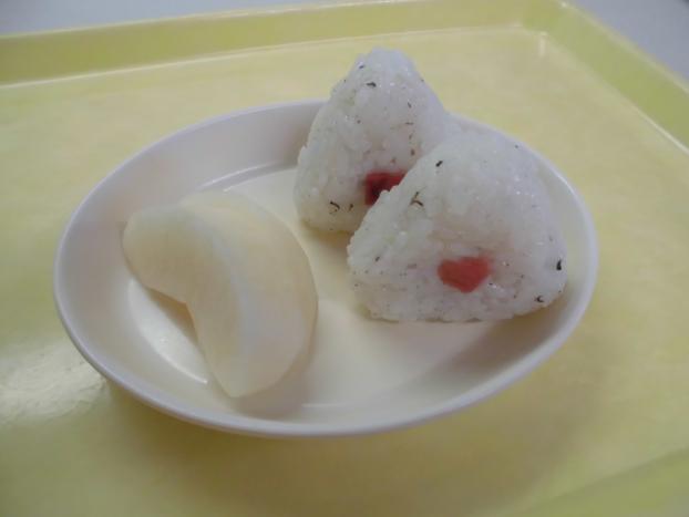 保育園で作った梅干しを使っておにぎり。梅干しを漬ける時に使った赤しそは、手作りゆかり!梅干しの酸っぱさも丁度良く、ゆかりの香りも爽やかで、余すところなく美味しく頂きました。