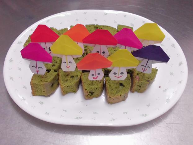 今月はケーキが抹茶の緑色、ピックはきのこにしたので、きのこが地面からはえているような感じでばっちりの組み合わせでした!盛り付けも、お皿にきのこたちが並んで可愛いです★