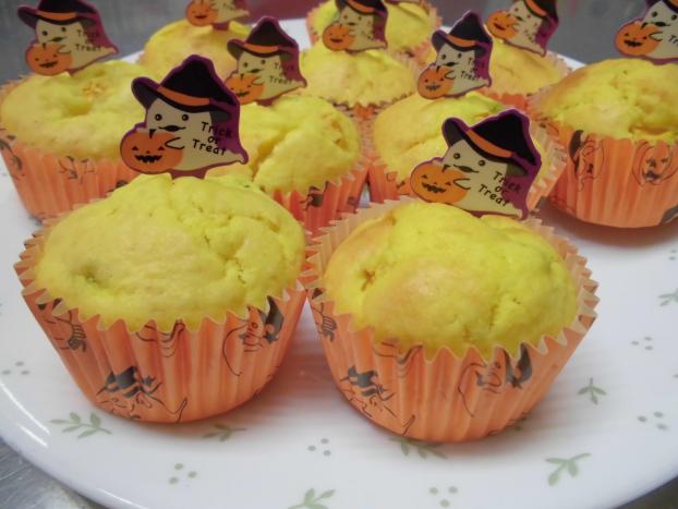 くま組のみんなはかぼちゃの仮装をして「トリックオアトリート♪」と給食室におやつを取りに来てくれましたよ☺マフィンにはおばけのピックをつけ、カップもハロウィンの柄で、1日早いハロウィンを楽しむことができました♪