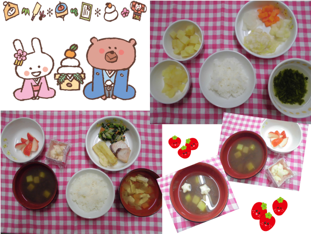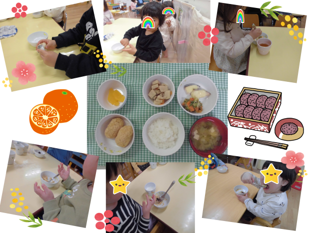 お餅は事故の危険があるため、園では餅の代わりにさつま芋を入れたぜんざいを食べてもらいました!