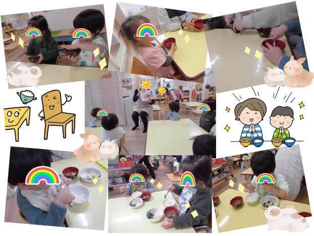 今日の給食前に、にじ組うさぎグループのおともだちに、食べると時の3つのお話をしました☆